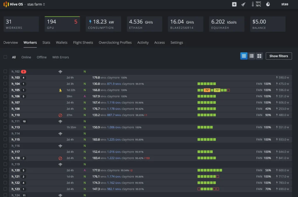 One Dashboard to Rule Them All: See the status of your entire farm in one glance. Total hash rate, active/inactive workers, power consumption, temperature averages, and profitability estimates are all front and center.