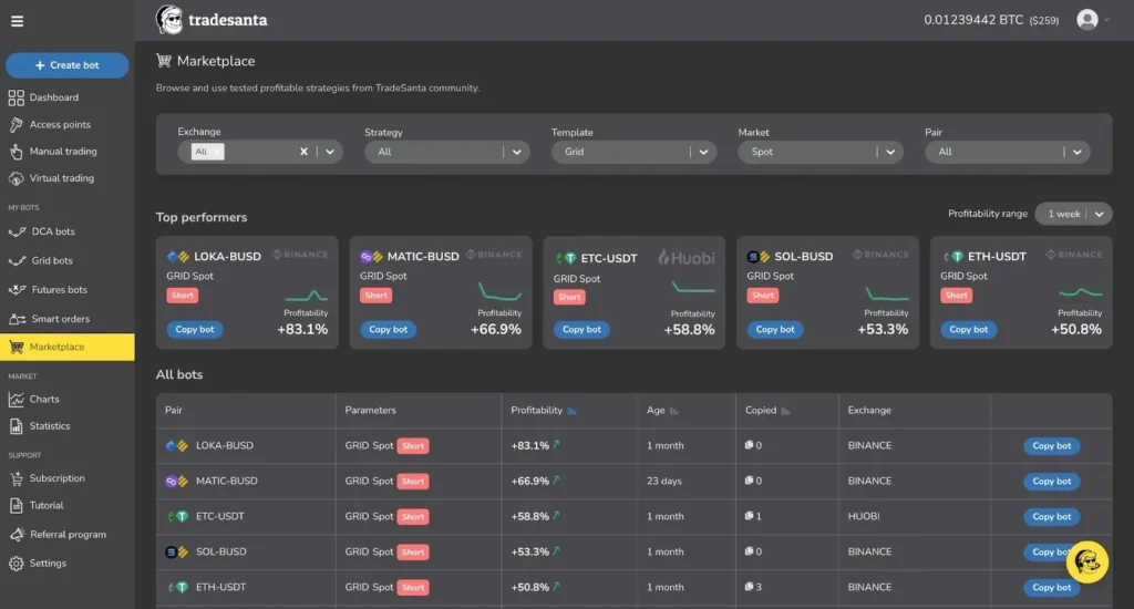 Best of all? You can test drive the entire platform with a 3-day free trial that gives you full access to all Basic plan features. No credit card required, no sneaky fine print – just a genuine opportunity to see if TradeSanta fits your trading style before you commit a single dollar .